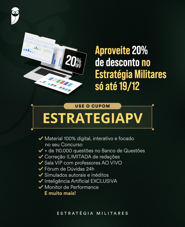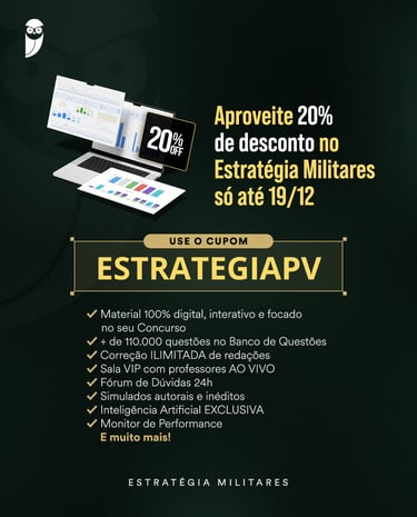 Utilize o cupom "ESTRATEGIAPV " e ganhe 20% de desconto nos produtos do Estratégia Militares!